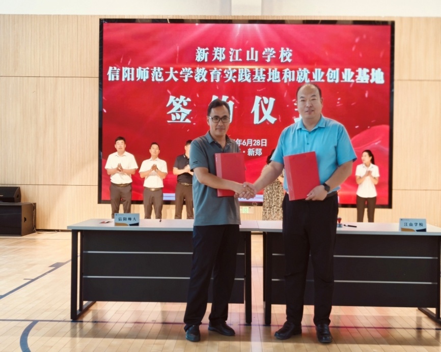 6月28日,beat365正版唯一官方网站副院长王红军、副书记曲剧、冷向宇老师、张钰老师一行四人赴新郑市江山学校考察,洽谈合作共建教育实践基地和就业创业基地事宜,受到新郑市江山学校校长孙伟涛和师生代表欢迎,并举行了热烈的签约和授牌仪式。