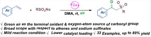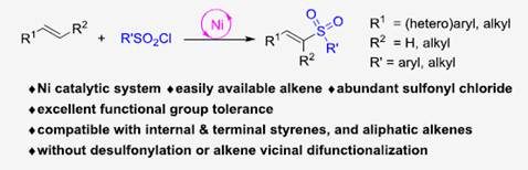 近日,beat365官网饶伟浩博士课题组在有机化学领域知名期刊《The Journal of Organic Chemistry》上先后发表了题为“Nickel-Catalyzed Direct Sulfonylation of Styrenes and Unactivated Aliphatic Alkenes with Sulfonyl Chlorides”、“Aerobic Copper-Catalyzed Oxysulfonylation of Vinylarenes with Sodium Sulfinates under Mild Conditions: A Modular Synthesis of β-Ketosulfones”(DOI:10.1021/acs.joc.4c00094; 10.1021/acs.joc.4c01660)的研究成果。该研究先后利用磺酰氯和亚磺酸盐作为磺酰化试剂,通过发展配体调控的镍盐催化体系和铜盐催催化体系,分别实现了由烯烃的直接磺酰化反应和烯烃的氧磺酰化反应合成一系列非对称有机砜化合物,解决了非活化烯烃的直接磺酰化反应难题。