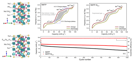 具有钠超离子导体 (NASICON) 结构的聚阴离子型化合物是钠离子电池正极材料的重要研究对象,该类材料拥有稳定的框架结构、较高的钠离子扩散系数,以及良好的安全性。Goodenough于2016年首次报道了富锰NASICON型正极材料Na3MnTi(PO4)3 (NMTP)的电化学性能,并引起了广泛的关注。然而,该材料中存在大量由于Mn占据Na2空位所产生的反占位缺陷,导致其充放电过程存在显著的电压滞后(voltage hysteresis)现象,进而严重影响了电化学性能。