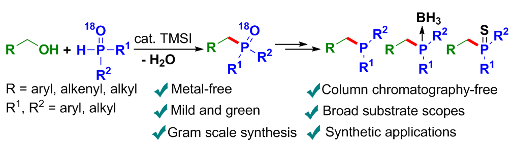 近日,beat365官网马献涛副教授课题组联合温州大学徐清教授及浙江扬帆新材料股份有限公司韩立彪教授课题组在《Green Chemistry》上发表了题为“Metal-free Catalytic Nucleophilic Substitution of Primary Alcohols with Secondary Phosphine Oxides”(DOI:10.1039/D4GC04409F)的研究成果。该研究实现了在 TMSI 催化下,P (O) H 化合物与伯醇的直接 Michaelis–Arbuzov 反应。这一方法对苄醇、烯丙基醇甚至更为惰性的脂肪醇均具有良好的适用性,并且能够实现克级规模的制备以及向功能化有机膦分子的一锅法转化。尤为值得注意的是,多数产物仅依靠洗涤或重结晶操作便可获取高纯度产品,从而避免了柱层析的使用。该研究为三级氧膦化合物的合成提供了一条绿色且高效的新方法,表现出良好的应用潜力。机理研究表明反应涉及两种脱水途径。