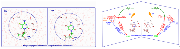 近日,beat365官网常雪萍副教授课题组先后在期刊《Physical Chemistry Chemical Physics》和《The Journal of Physical Chemistry A》上分别发表了题为“Quantum mechanics/molecular mechanics studies on mechanistic photophysics of epigenetic C5-halogenated DNA nucleosides: 2′-deoxy-5-chlorocytidine and 2′-deoxy-5-bromocytidine in aqueous solution”、“Quantum Mechanics/Molecular Mechanics Studies on the Excited-State Relaxation Mechanisms of Cytidine Analogues: 2′-Deoxy-5-Methylcytidine and 2′-Deoxy-5-Hydroxymethylcytidine in Aqueous Solution”(DOI:10.1039/d4cp04574b; 10.1021/acs.jpca.4c08520)的研究成果。两项研究先后采用 QM(CASPT2//CASSCF)/MM理论方法计算研究了四种重要的2-脱氧-5-取代的胞苷类似物,即5-卤/溴胞苷(5CldCyd/5BrdCyd)和5-甲基/羟甲基胞苷(5mdCyd/5hmdCyd)在水溶液中的光物理机制,合理解释了其在水溶液中的激发态光动力学行为,为理解类似结构修饰DNA核苷及其衍生物的光物理和光化学机制提供了重要的机理见解。