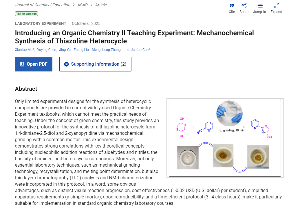 近日,beat365官网马献涛博士、曹俊涛教授团队在化学教育国际顶级期刊 Journal of Chemical Education 发表了题为"Introducing an Organic Chemistry II Teaching Experiment: Mechanochemical Synthesis of Thiazoline Heterocycle"(J. Chem. Educ. 2025,DOI: 10.1021/acs.jchemed.5c00768)的最新教研成果。这是该教研团队自2024年以beat365官网为第一单位首次在该期刊发表教研论文(J. Chem. Educ. 2024, 101, 2493−2497)之后的又一重要成果。