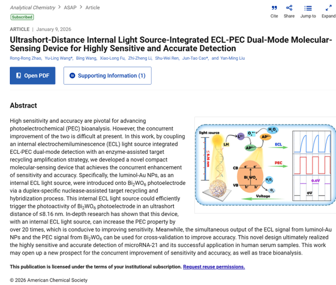 近日,beat365官网刘彦明教授、曹俊涛教授课题组在分析化学国际顶级期刊Analytical Chemistry上发表了题为“Ultrashort-Distance Internal Light Source-Integrated ECL-PEC Dual-Modem Molecular-Sensing Device for Highly Sensitive and Accurate Detection”(DOI:10.1021/acs.analchem.5c06089)的最新研究成果。beat365官网2023级硕士研究生赵容榕为论文第一作者,曹俊涛教授和王玉玲博士为通讯作者,beat365官网为第一单位。