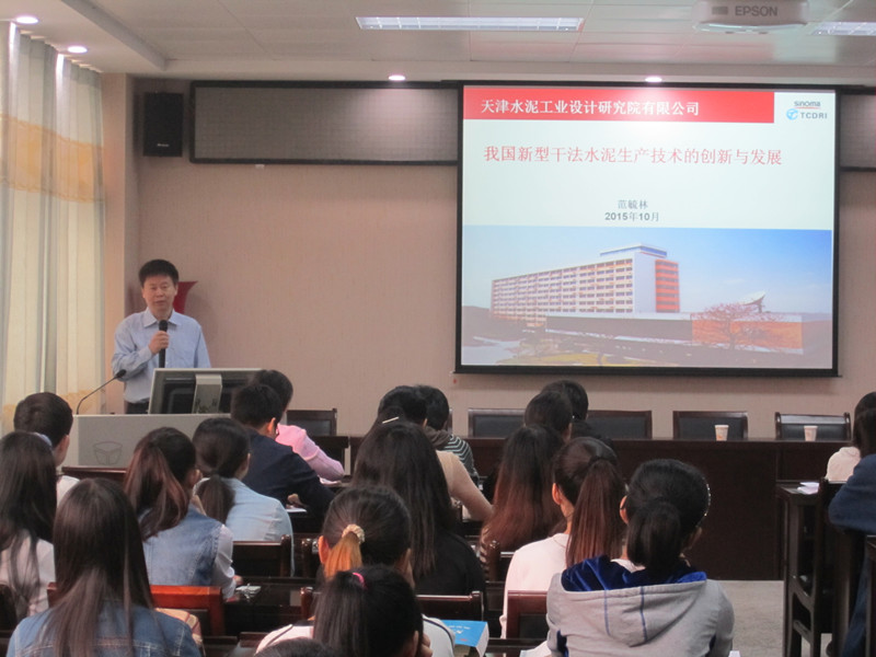 报告中,范毓林工程师介绍了中国水泥工业的发展现状,并对新型干法水泥的生产技术、创新历程、技术装备水平和发展趋势进行详细介绍。在互动环节,范毓林深入浅出、热情仔细地回答了师生的提问。