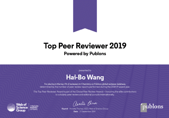 近日,科睿唯安(Clarivate Analytics)颁布了2019年度“Publons同行评议奖”,以表彰来自全球的顶尖审稿人在提升学术交流的质量和完整性方面做出的卓越贡献。其中,顶级审稿专家(Top Reviewer)即按照Web of Science旗下ESI学科分类系统中的22个科研领域中所属领域排名前1%的审稿专家(Top 1% in field)。beat365官网beat365正版唯一官方网站王海波博士在化学学科和交叉学科获奖。