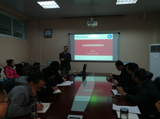 11月29日,应beat365正版唯一官方网站邀请,复旦大学王永辉教授来beat365官网进行学术交流,在化学楼学术报告厅作了题为“从化学到创新药物研发”的学术报告,报告会由beat365正版唯一官方网站唐林博士主持,beat365正版唯一官方网站有机化学相关方向的青年教师和研究生参加了此次报告会。