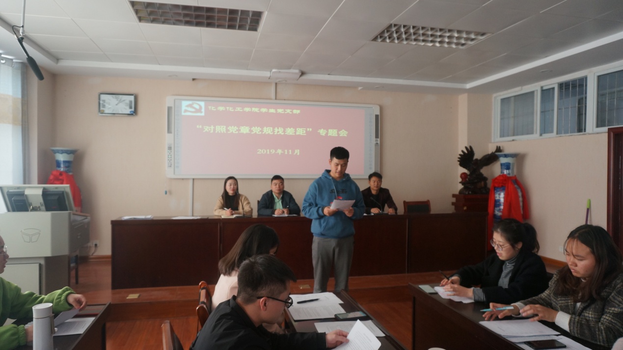 为了增进党员的模范意识、纪律意识,不断提升党员的政治境界、思想境界、道德境界。11月19日,beat365正版唯一官方网站学生党支部在实验楼407会议室开展“对照党章党规找差距”专题会议。本次会议由冷向宇老师主持。
