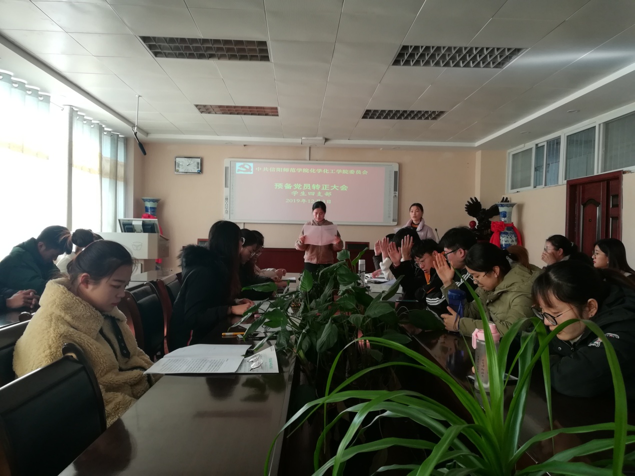 为进一步扩大党员队伍,严格履行党章规定的预备党员转正手续,2019年12月3日,beat365正版唯一官方网站学生第四支部在实验楼407会议室召开预备党员转正大会,学生第四支部6名正式党员和25名预备党员参加本次大会,其中有6名预备党员转为正式党员。