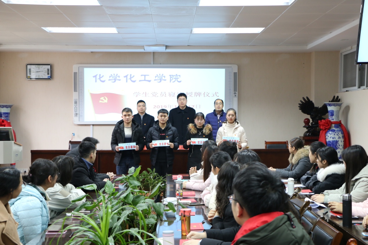 会上,吴志伟、冷向宇、邓耀辉向新入党党员代表发放党徽,为学生党员寝室授牌。