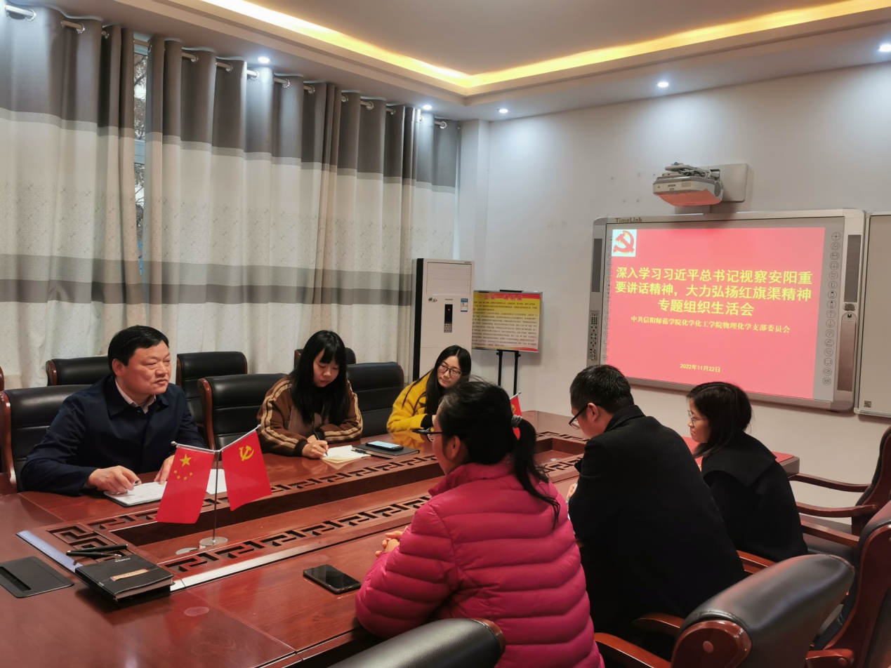 11月22日下午,物理化学党支部在化学楼党员之家召开“深入学习习近平总书记视察安阳重要讲话精神,大力弘扬红旗渠精神”专题组织生活会。学院党委书记郭鹏参加所属党支部组织生活会并作指导,支部全体党员参加了专题组织生活会。会议由物理化学支部书记常雪萍主持。