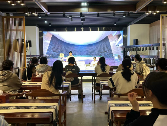 活动伊始,茶艺表演队以“走进茶文化,体验茶文化”为主题介绍茶文化馆的组成——妙手茶坊、创意茶生活、艺术体验,形成了可观、可处、可感的新体验。接着,在茶艺队员的带领下,全体成员参观了茶文化馆,了解了茶之源、茶树的起源及分类、茶的发现和利用、中国四大茶区分布等茶文化。随后,茶艺队员以西湖龙井、洞庭碧螺春、信阳毛尖、安溪铁观音这四种历史名茶为代表,向大家详细介绍其特色。除此之外,茶艺队员还向学生演示了泡茶的八个步骤并指出了“茶道六君子”,分别为茶筒、茶漏、茶夹、茶针、茶匙、茶。最后,学生们在悠悠茶室里欣赏由茶艺表演队带来的精彩表演。