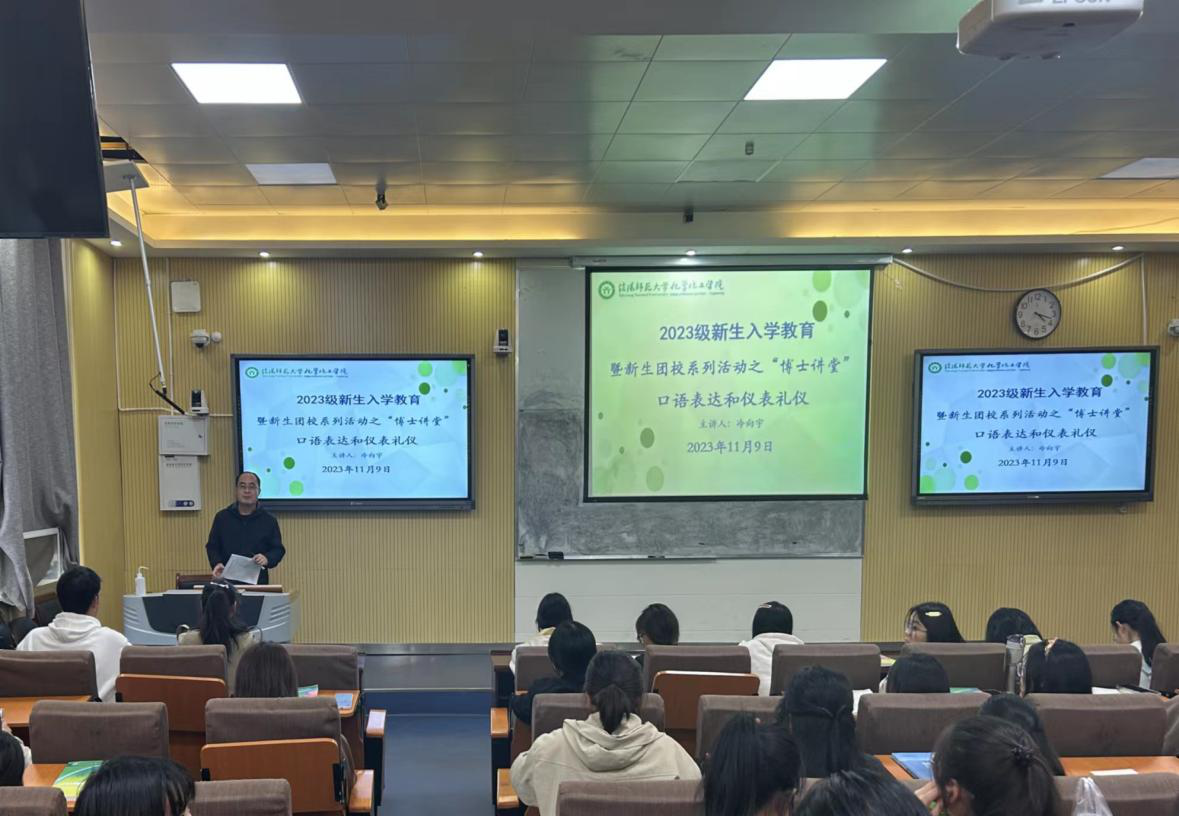 冷向宇以“口语表达和仪表礼仪”为题,通过例举著名主持人杨澜在大学期间成功面试某档综艺从而迈出成功第一步的故事,告诉同学们在大学生活中要做到:一要保持良好的身体素质;二要加强知识、能力和技能的储备;三要培养良好的职业意识;四要做好对于挫折的心理准备;五要具备一定的人文素养。他告诫同学们大学四年要通过注意以上几个方面能力的培养来提升个人综合素质,从而顺利迈出人生路上成功的第一步。冷向宇通过讲解规范着装引导同学们要注意个人礼仪,严格遵守“敬人、宽容、适度、真诚”原则;关注个人仪容仪表,做到自然美、修饰美、内在美,遵照“美观、整洁、卫生、得体”的基本规则,学会在特定场合中以特定形象示人,达到大方宜礼的外在效果。