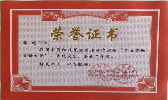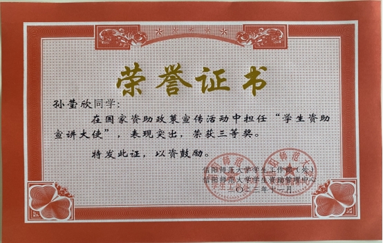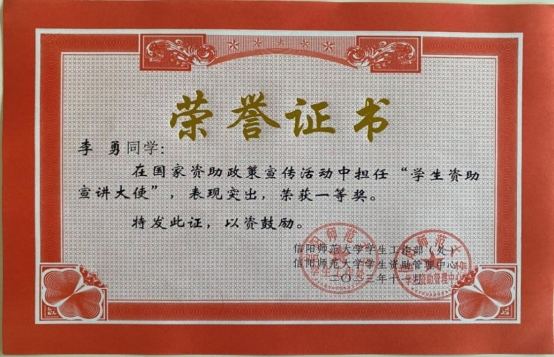 为把党和国家对家庭经济困难学生的关怀进一步落实、落细,学校学生资助管理中心利用假期时间开展送政策下乡、送政策回母校等资助宣活动。学领导对此高度重视,受助学生积极报名参与,他们回母校、进社区、入村镇分发资助宣传材料,深入实地开展资助政策宣讲,用通俗易懂的语言解答学生和家长的疑问。经beat365官网资助管理中心研究决定,授予2021级化学2班李勇同学为一等奖,2021级3班常畅同学为二等奖,2021级化学1班孙莹欣同学为三等奖。