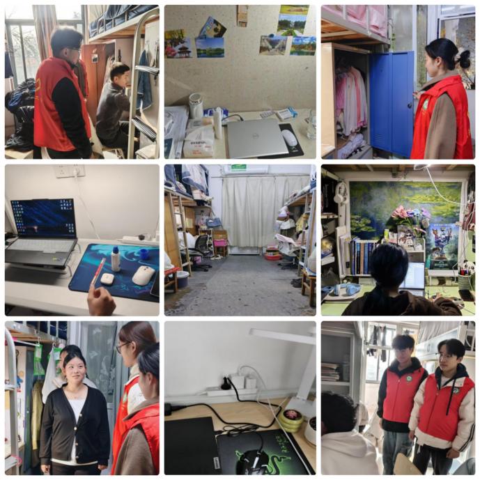 本次检查紧密结合学校《冬季校园消防安全提示》要求,旨在以近期社会及高校发生的火灾事故为镜鉴,将消防安全压力传导至“最后一米”,确保各项安全管理制度在学生宿舍落地生根。检查重点严格对标学校提示内容,聚焦用电安全、违禁物品、通道畅通、行为规范等关键环节。检查内容包括:是否存有或使用电热毯、电饭煲、电暖炉等违规大功率电器;是否存在私拉乱接电线、移动插座串联、电器设备长时间通电等不安全用电行为;充电宝、化妆品等易燃易爆物品是否远离热源妥善存放;消防通道、楼梯间、安全出口是否被杂物堵塞;是否存有明火器具或存在室内吸烟迹象;是否了解基本消防知识和应急疏散路线等。检查过程中秉持“教育引导与排查整改相结合”的原则。对于发现的一般性安全隐患,如插座放置不当、物品堆放略杂乱等,现场督促学生立即整改。对于可能存在的风险苗头,检查人员耐心向同学们讲解学校消防安全规定,结合相关案例,深刻剖析违规用电用火的严重危害,重申“人走断电”、通道畅通的重要性,引导学生自觉树立“安全第一”的主人翁意识,将安全规范内化为日常习惯。