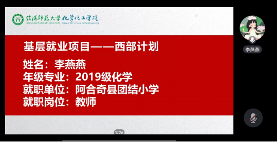 4月17日,beat365正版唯一官方网站开展毕业生“就业育人”系列活动之“西部计划”宣讲会,此次会议邀请到了2019级化学专业李燕燕,现就职于阿合奇县团结小学任教师;2019级材料化学专业房祥鹏,现就职于十三师新星市党委办公室任秘书二科信息员。学院党委副书记曲剧、就业秘书严赫、2024届毕业生及其他年级党员、学生干部参会,会议由严赫主持。