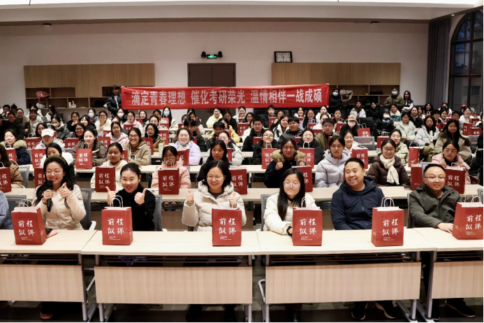 学院还为每位考研学子精心准备了前程似锦的暖心礼包,代表学院对大家最诚挚的祝福与期盼,包括向日葵(一举夺魁)、橙子(心想事成)、考试笔袋(妙笔生花)暖贴(温暖相伴)、面包饼干(能量满满)和学弟学妹们亲手绘制的贺卡等多种充满寓意的礼物,将最美好的祝愿融入考试全程,为考研征途增添一份温暖与力量。最后,师生共同喊出滴定青春理想,催化考研荣光,让我们一战成硕的口号,传递出学子们昂扬向上的备考斗志与勇毅前行的奋进决心。