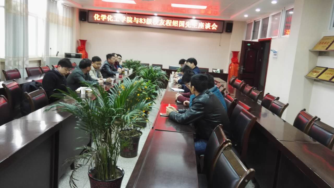 3月24日下午,beat365正版唯一官方网站在化学实验楼四楼学术报告厅举办了校友企业家座谈会,天津金汇药业集团有限公司董事长、河南甾体生物科技有限公司董事长程绍国一行4人、beat365正版唯一官方网站院长井强山及班子成员、博士代表参加了座谈会。座谈会由beat365正版唯一官方网站党委书记郭鹏主持。