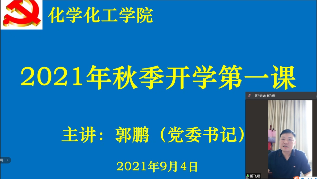 郭鹏结合2021年暑期防灾抗疫工作,以7月1日习近平在庆祝中国共产党成立100周年大会的重要讲话引入,从中国共产党的产生发展、改革开放的伟大实践和新时代的新征程、中国共产党百年发展的成功经验与启示等方面重点讲解,集中阐述了党的百年历程。郭鹏通过对共产党初期的艰难抗争到中国共产党领导社会主义革命建设的介绍,使同学们加深了对党史的了解,他希望同学们做到知史爱党、知史爱国;通过讲解新中国在党的领导下取得的伟大成就,要求大家将党史学习总结好、传承好、发扬好,将社会主义核心价值观融入日常行为习惯,展现新时代大学生的良好风貌。他介绍,习近平总书记9月1号在中央党校秋季青年干部培训班开班仪式上作了重要讲话,再次强调,青年是国家的未来和希望,中国共产党成立100周年之际,“十四五”胜利开局,“两个一百年”征程历史交汇,新时代大学生正身处在难得的历史机遇中,在全球深刻变革大背景下,青年人肩上的责任尤为重大。郭鹏勉励化学化工青年学子要进一步坚定道路自信、理论自信、制度自信、文化自信,增强做中国人的志气、骨气、底气,树立为祖国为人民永久奋斗、赤诚奉献的坚定理想。不负时代、不负韶华、不负人生,为实现中华民族伟大复兴添砖加瓦、不懈奋斗。