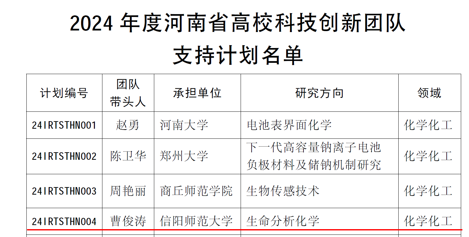 近日,河南省教育厅公布了2024年度河南省高校科技创新团队和创新人才立项名单(教科技〔2023〕325号文件),beat365官网曹俊涛教授牵头申报的“功能纳米材料生物分析”研究团队获得河南省高校科技创新团队项目支持,资助金额为50万元。