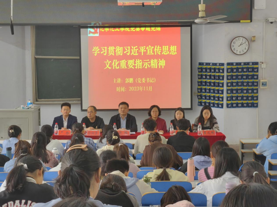 郭鹏宣讲解读了习近平总书记对宣传思想文化工作的重要指示精神和全国宣传思想文化工作会议精神、校党委有关通知文件精神。