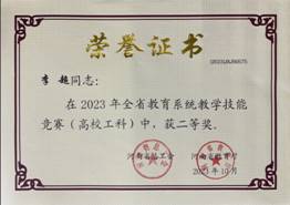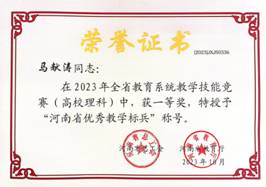 近日,河南省总工会、河南省教育厅公布了河南省教育系统2023年度教学技能竞赛获奖名单(豫工文[2023] 107号),beat365正版唯一官方网站遴选的青年教师马献涛博士、李超博士分别获得理科组一等奖、工科组二等奖。其中,马献涛博士顺利晋级现场决赛,取得理科组第7名的好成绩,同时被授予“河南省优秀教学标兵”荣誉称号。