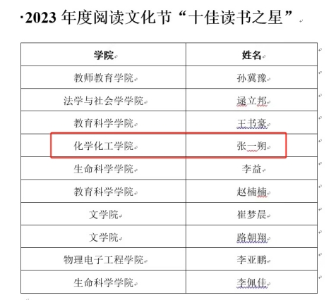 2023年度,beat365正版唯一官方网站读者入馆人次位居第二,读者借阅图书册数和人均借阅册数位居全校前列,荣获2023年书香校园建设“十佳单位”。此外,2022级化学专业学生张一朔位居全校年度外借图书册数第四,被评为“十佳读书之星”。