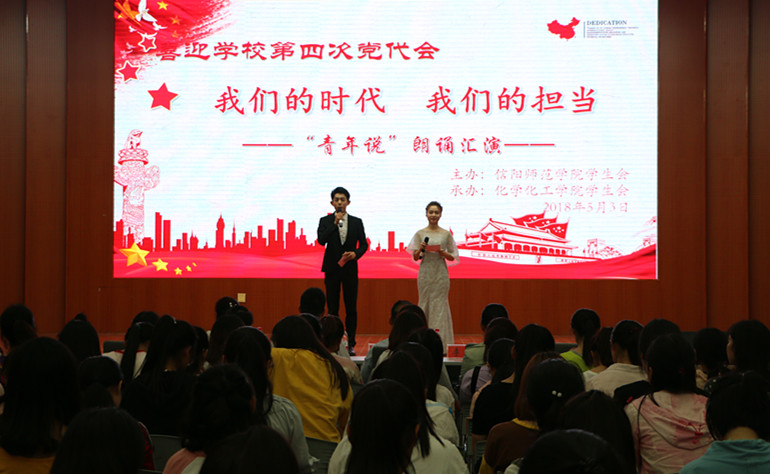 为喜迎信阳师范学院第四次党代会,传承五四精神,唱响中国梦,5月3日晚,beat365正版唯一官方网站在逸夫楼报告厅隆重举办“我们的时代 我们的担当”朗诵汇演。校党委宣传部、学生处、校团委以及beat365正版唯一官方网站相关负责同志与来自8个学院的五百余名学生参加了此次活动。