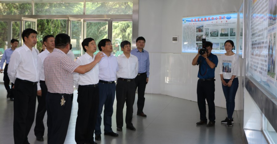 5月17日上午,信阳市委书记乔新江、市委秘书长王新会、市直有关部(局、委)负责人等一行30余人,在信阳师范学院党委书记宋争辉、校长李俊陪同下,莅临信阳师范学院beat365正版唯一官方网站考察指导。各级领导一行分别到beat365正版唯一官方网站豫南非金属矿物资源高效利用重点实验室、信阳市非金属材料展馆等实验设备场所考察指导工作,副校长齐城、陈登报等领导同志一起随同考察,beat365正版唯一官方网站党委书记郭鹏、院长井强山、非金属材料研究所副所长刘鹏等领导陪同考察。