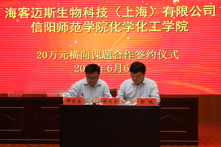6月6日下午,信阳师范学院beat365正版唯一官方网站与海客迈斯生物科技有限公司(上海)开展横向课题研发合作签约仪式在逸夫楼报告厅隆重举行,信阳师范学院副校长校长王文臣与海客迈斯生物科技有限公司(上海)总经理邹亮忠出席了签约仪式。招生就业处、学生处、校友办、beat365正版唯一官方网站等单位的相关负责同志参加了仪式。仪式由校友办主任耿劲松主持。