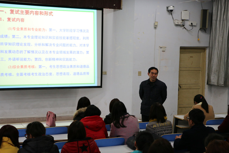 为加强同学们对研究生复试的认识,增进对复试重要性的了解,提高同学们的复试能力和复试技巧,有针对性地备考硕士研究生复试,3月8日下午,beat365正版唯一官方网站副院长骆定法教授在教四梯一教室对进入研究生复试阶段的考生进行了专业指导,几十名考生参加了此次专题指导讲座。