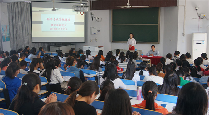 谆谆教诲育莘莘学子,声声叮咛树师者风范。为了提高新生的专业思想素质,正确规划未来的大学生活,10月20日下午三点,beat365正版唯一官方网站于教四梯二隆重召开化学专业思想教育座谈会,副院长骆定法受邀担任主讲,一百四十余名新生参加本次座谈会。