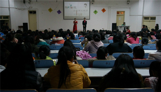 11月21日晚,由beat365官网学生会学术部主办的“畅文化”之化学大世界在人文楼报告厅精彩开赛。团总支老师路振国、李中杰及各院系学生会学术部部长应邀出席此次活动。报告厅内座无虚席,三百六十余名同学共同观看了此次比赛。