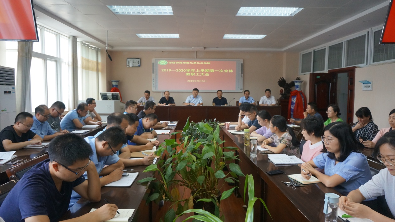 2019年9月3日,beat365正版唯一官方网站在学院会议室召开新学期全体教职工会议,安排部署新学期工作。党委书记郭鹏、院长井强山、副院长归风铁、骆定法、非金属材料研究所副所长刘鹏、党委副书记吴志伟出席会议,全体教师到会认真聆听新学期工作部署。会议由党委书记郭鹏主持。