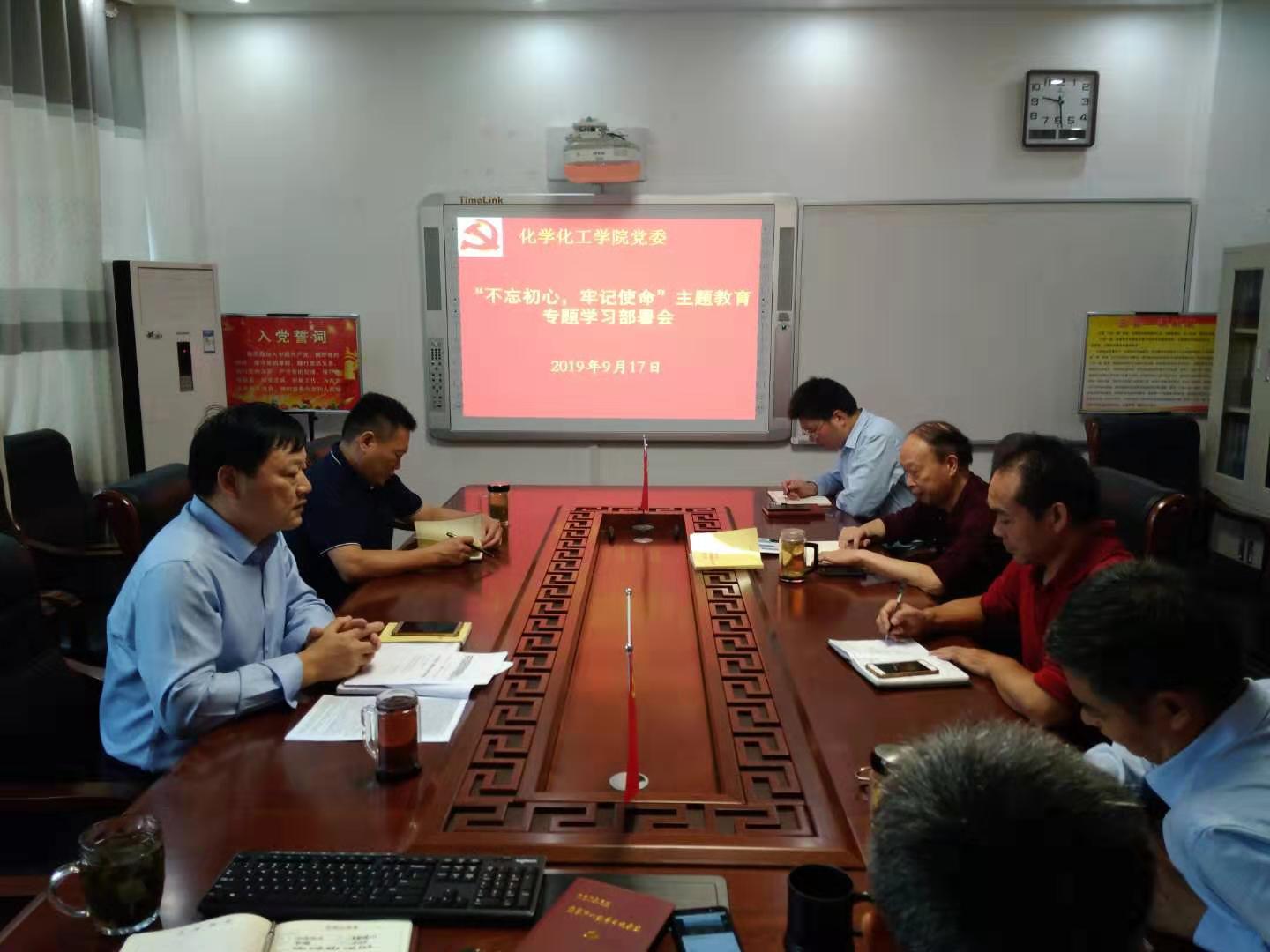 9月17日上午,化学与化工学院党委中心学习组在实验楼“党员之家”开展集体学习,传达、学习习近平总书记关于“不忘初心 牢记使命”主题教育的系列重要讲话精神,为学院主题教育打好思想基础,学院党委书记郭鹏主持会议。