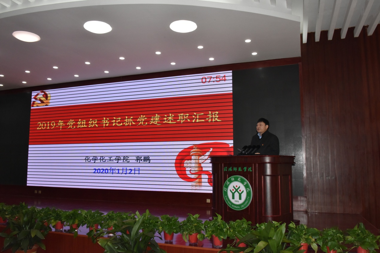 郭鹏坚持“抓好党建是本质,抓不好党建是失职,不抓党建不称职”理念,把准政治方向,落实立德树人,尽心尽力、尽职尽责,深入推进全面从严治党向基层支部延伸,以党建推动事业发展。他从六个方面进行述职汇报,一、学院基本情况;二、“不忘初心、牢记使命”主题教育情况;三、巡视整改情况;四、主要做法及工作创新;五、问题及原因分析;六、工作计划和努力方向。郭鹏表示,在校党委的正确领导下,学院分党委准确把握新时期新形势工作重点,以习近平新时代中国特色社会主义思想为指导,全面学习贯彻党的十九大、十九届二中三中四中全会精神,认真学习贯彻落实习近平总书记系列重要讲话,特别是注重抓好领会贯彻落实习近平总书记视察河南重要讲话精神,带头示范,全面加强党的政治建设,坚持党要管党,全面从严治党,坚持党是领导一切的,以增强基层党组织的组织力,提升创造力、凝聚力和战斗力为目标,加大“两化一创”创建力度,抓好“强基引领”三年行动,大抓基层组织建设,重视基层基础,持续开展“两学一做”制度化常态化,严肃党内政治生活,严格落实“三会一课”,严格党员教育管理,开展党员争先创优,开拓创新,踏实工作,有力提升了党建,有效促进了发展。