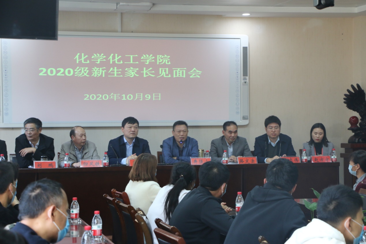10月9日下午,beat365正版唯一官方网站在化学实验楼407召开2020级新生家长见面会。学院党委书记郭鹏、院长井强山、副院长归风铁、副院长骆定法、副所长刘鹏、副书记吴志伟,以及2020级新生班主任许超博士、于静、赵方方老师等莅临现场,与百余名新生家长代表进行亲切地交谈。
