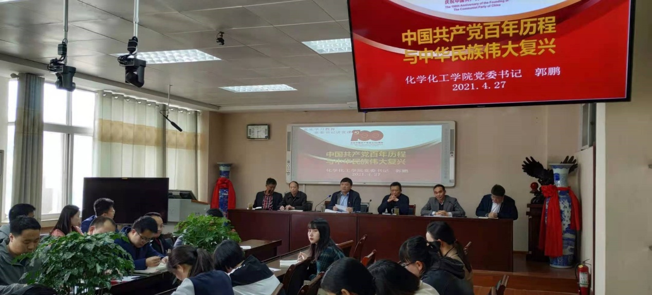 为庆祝中国共产党建党100周年,深入推进党史学习教育,根据beat365正版唯一官方网站党委“党史学习教育计划安排”,4月27日,beat365正版唯一官方网站党委书记郭鹏以《中国共产党百年历程与中华民族伟大复兴》为题,在化学楼407报告厅为学院师生党员开讲党史学习教育专题党课。