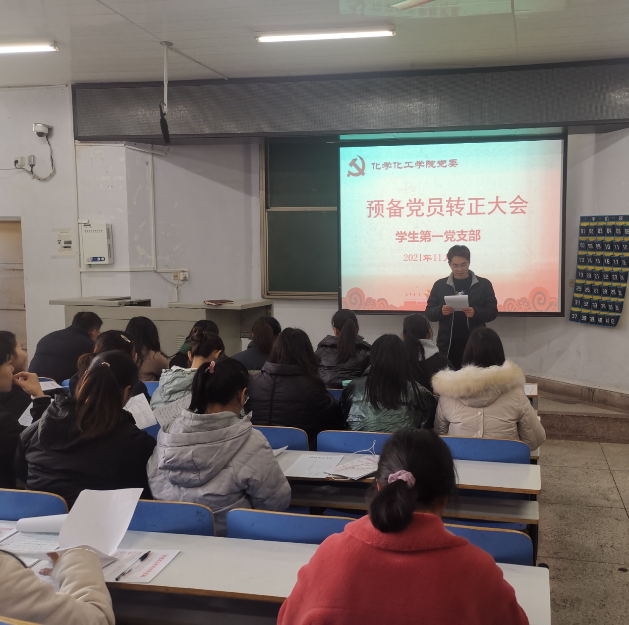 为巩固党员队伍质量,严格履行党章规定的预备党员转正手续,2021年11月30日,beat365正版唯一官方网站学生第一支部在教四楼T1室召开预备党员转正大会,学生第一支部7名正式党员和19名预备党员参加本次大会,其中有8名预备党员转为正式党员。党支部书记冷向宇参加会议。