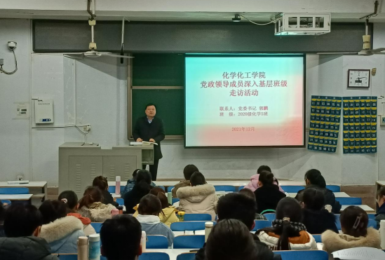 12月17日,beat365正版唯一官方网站开展党政领导深入基层班级走访活动,学院党委书记郭鹏深入2020级化学5班为学生上开讲《形势与政策》思政课,活动由严赫主持。