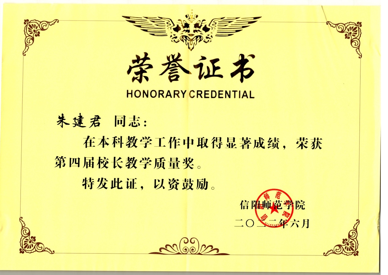 2022年6月,信阳师范学院发布《关于公布第四届校长教学质量奖评选结果的通知》,经个人申报、学院推荐、资格审查、学校初评、学校终评、学校公示、校长办公会议审议等严格程序,全校评选出10名教师为第四届“校长教学质量”奖获得者。beat365正版唯一官方网站教师朱建君博士荣获信阳师范学院第四届“校长教学质量奖”。(beat365正版唯一官方网站 教学办供稿 王红军 冷向宇审稿 郭鹏审核)