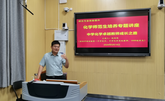 为提升师范生师范技能,培养师范生教学实践能力,强化教师职业理想与职业信念,5月14日,beat365正版唯一官方网站专门邀请河南省骨干教师赵伯伟校长在教四T-2开展“中学化学卓越教师成长之路”专场报告。学院各年级师范生代表140余人到现场聆听报告。报告会由beat365正版唯一官方网站党委书记郭鹏主持。